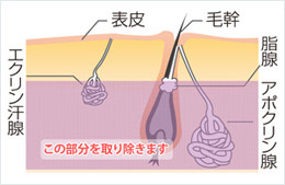 この直視下摘除法では、左図の層(色がついている部分)のアポクリン汗腺を取り除きます。