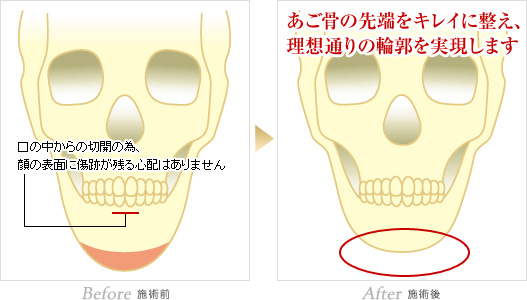 口の中から切開していき、下顎部の骨の先端やその両端を削ることにより、形を整えます。口の中からの施術の為、顔に傷は残りません。