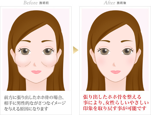傷跡を残さず、日帰り治療でほほ骨をキレイに整える事が可能です。