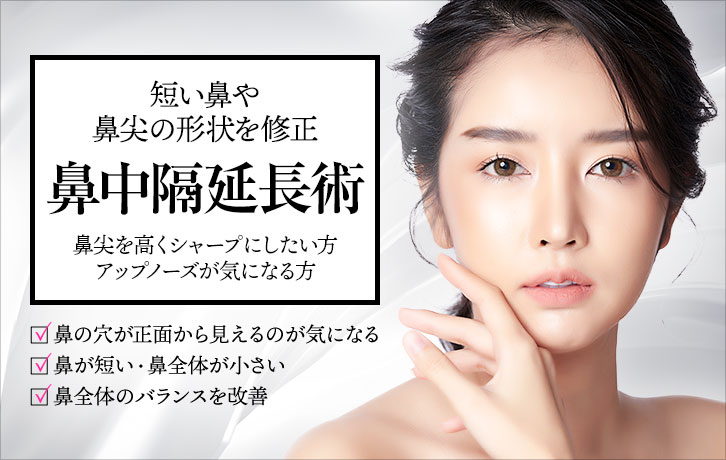 鼻中隔延長術は、鼻中隔軟骨や耳介軟骨あるいは肋軟骨を用いて鼻尖や鼻柱を前下方に延長し、短鼻や鼻尖の形状を修正する手術です。