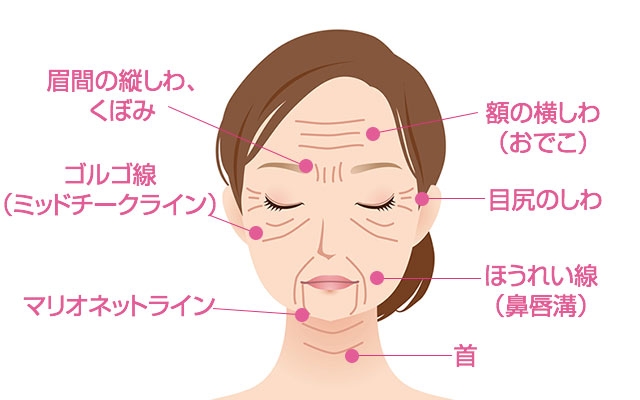 加齢によって真皮層にあるコラーゲン・ヒアルロン酸・エラスチンなどの量が減少し、また肌細胞がこれらを作る機能が衰えると、肌のハリが失われ、皮膚によれができそれがしわとなります。