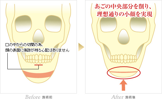 口の中から切開していき、下顎部の骨の先端やその両端を削ることにより、形を整えます。口の中からの施術の為、顔に傷は残りません。