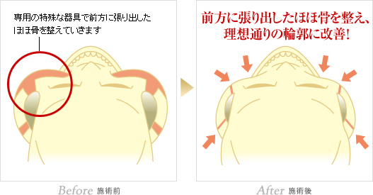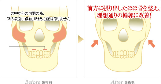 また一般的に、口の中から近い、目の下あたりの前に突き出ているホホ骨を削る場合に適しています。
